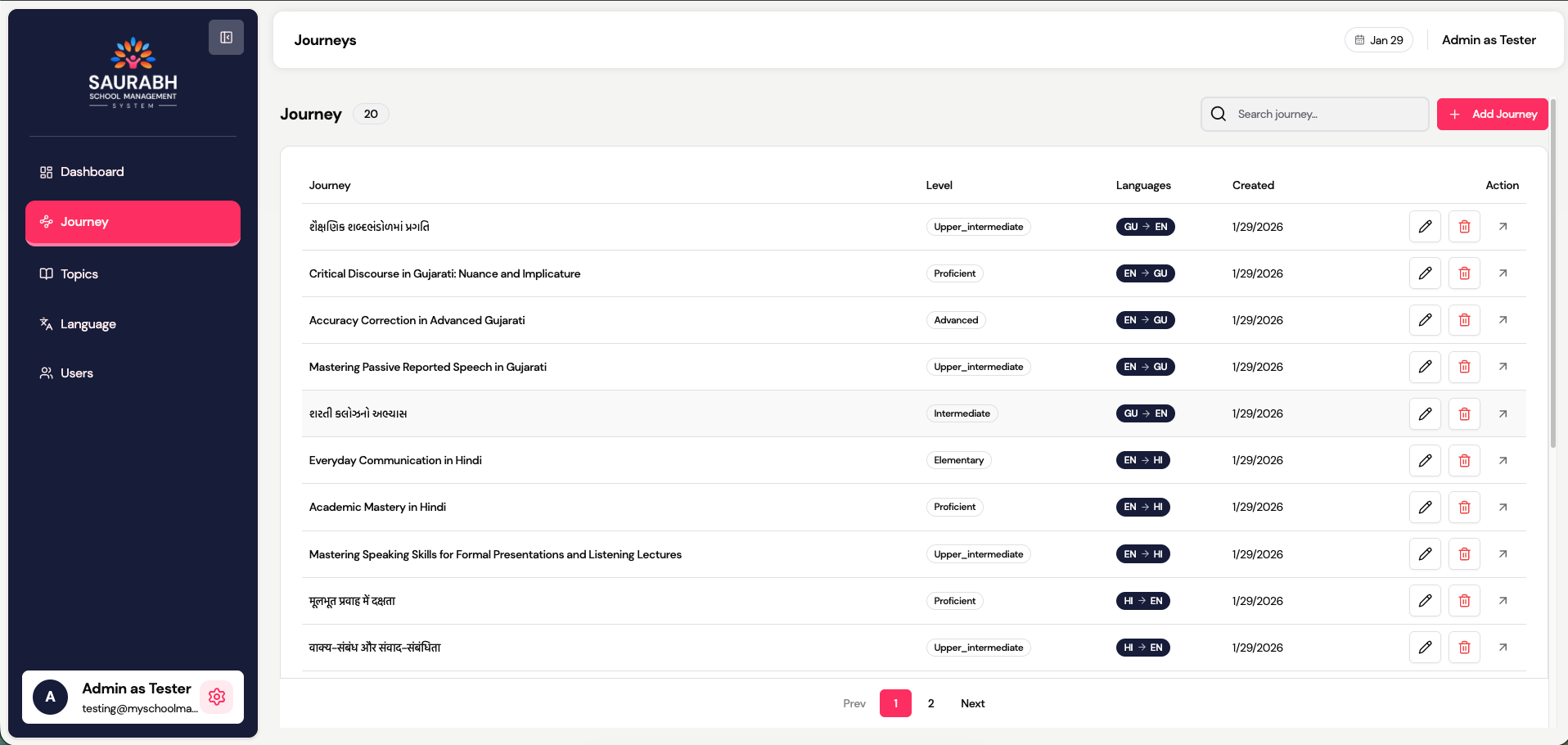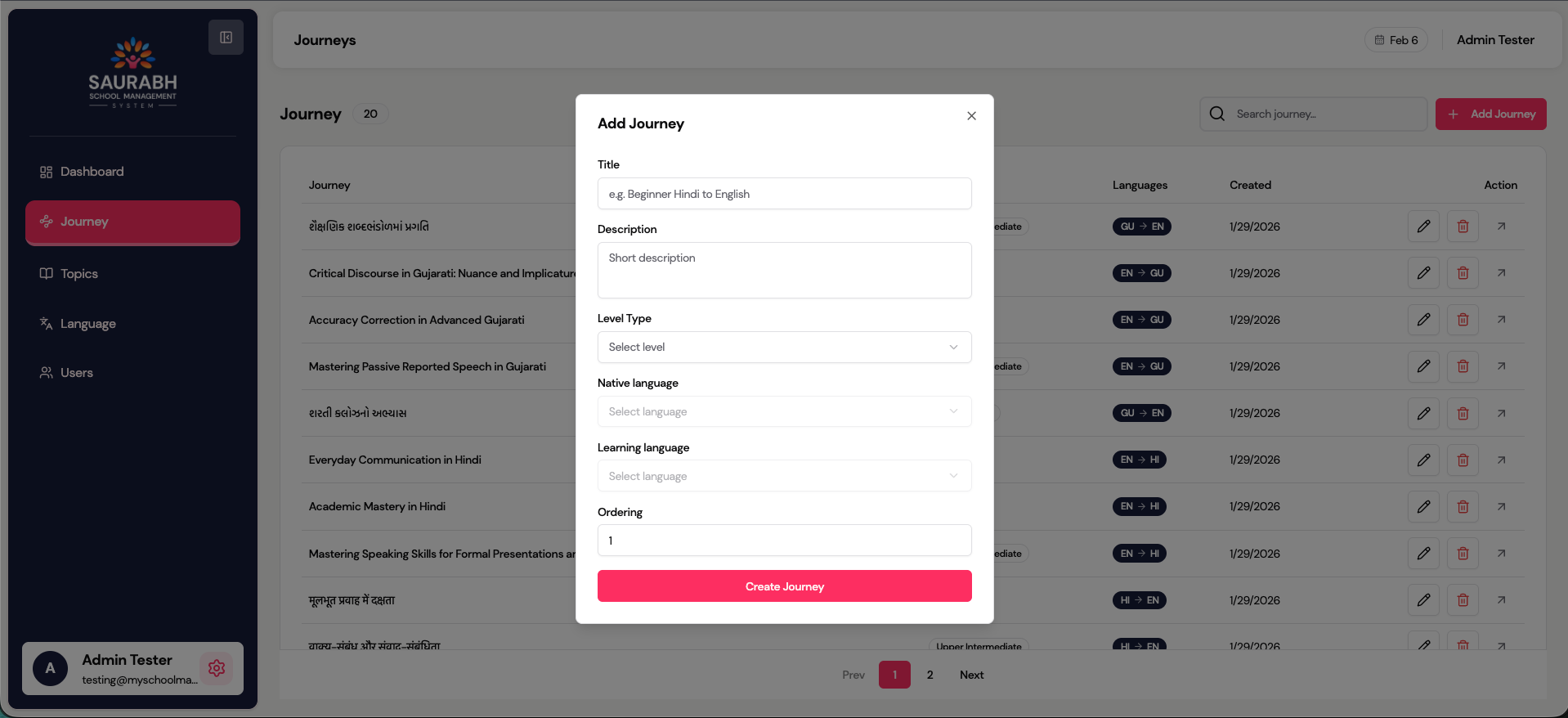 Journeys represent structured language learning paths assigned to students.