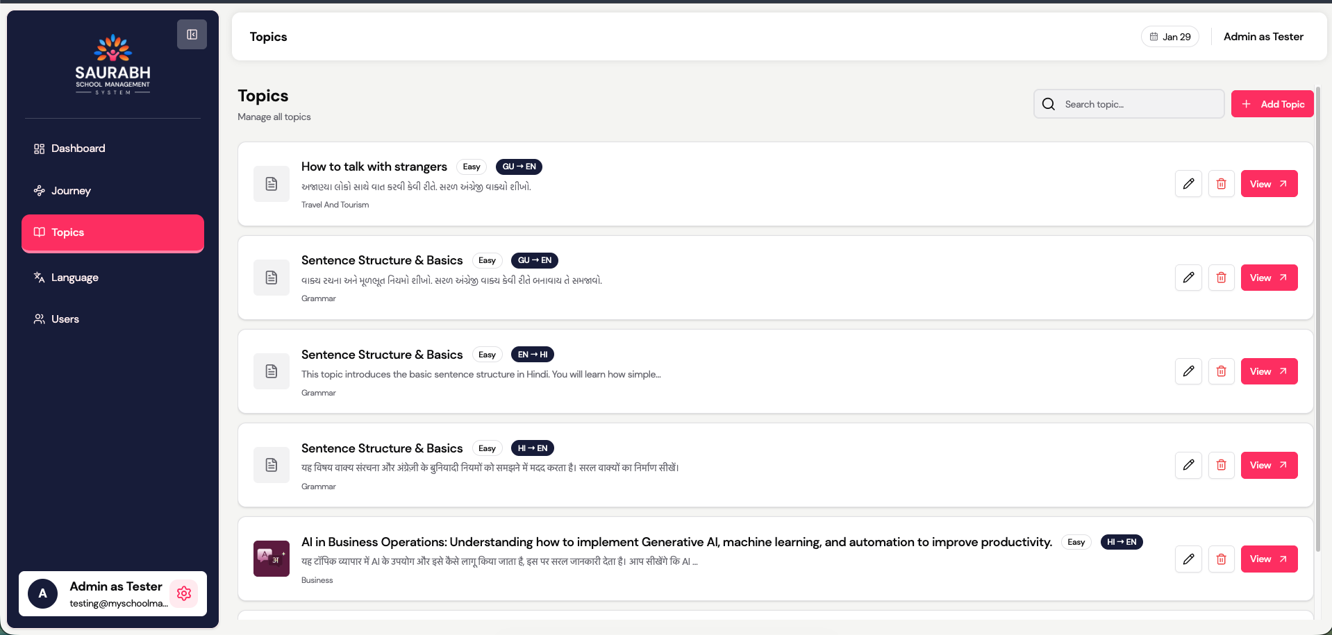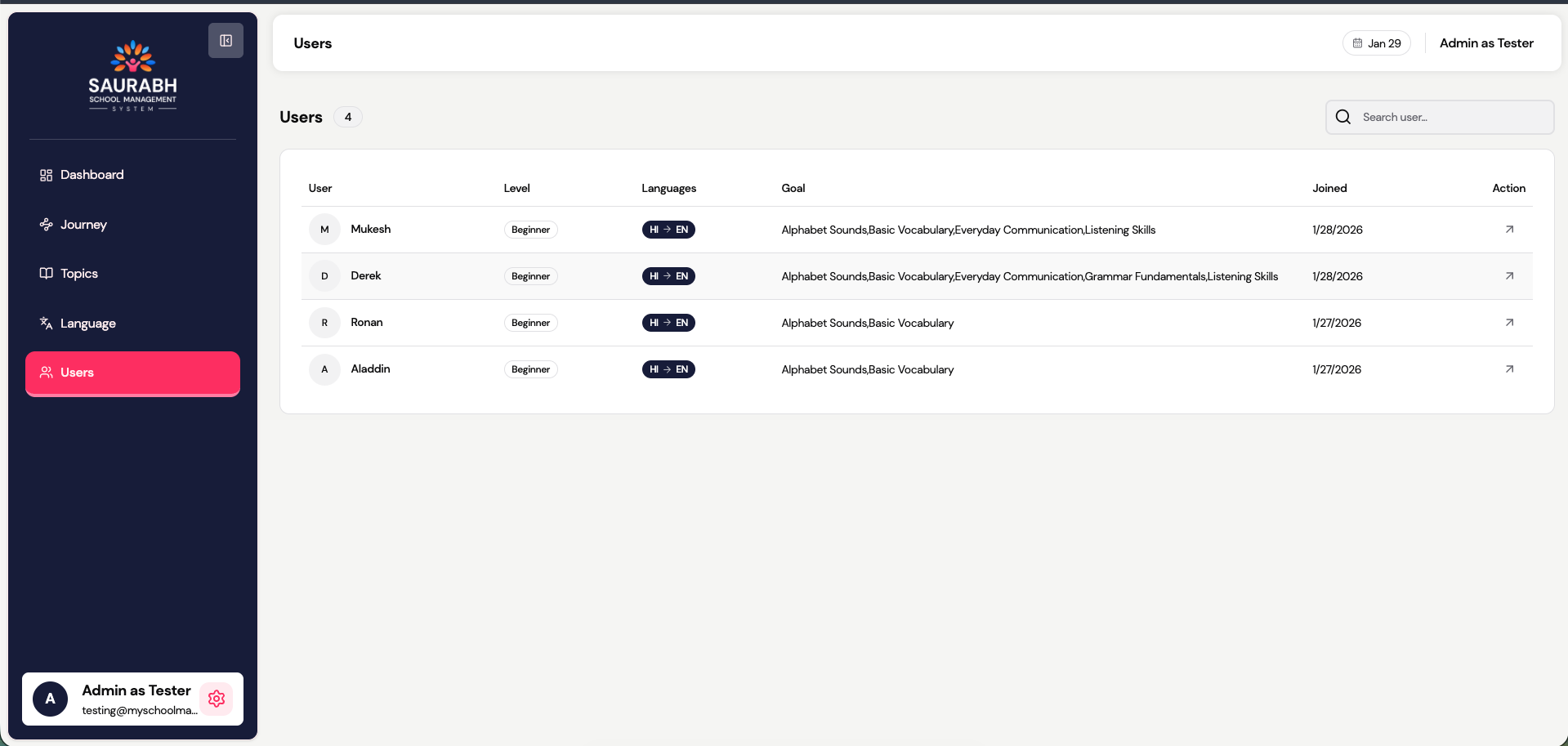 - School Admins – system setup, language configuration, journey management, analytics