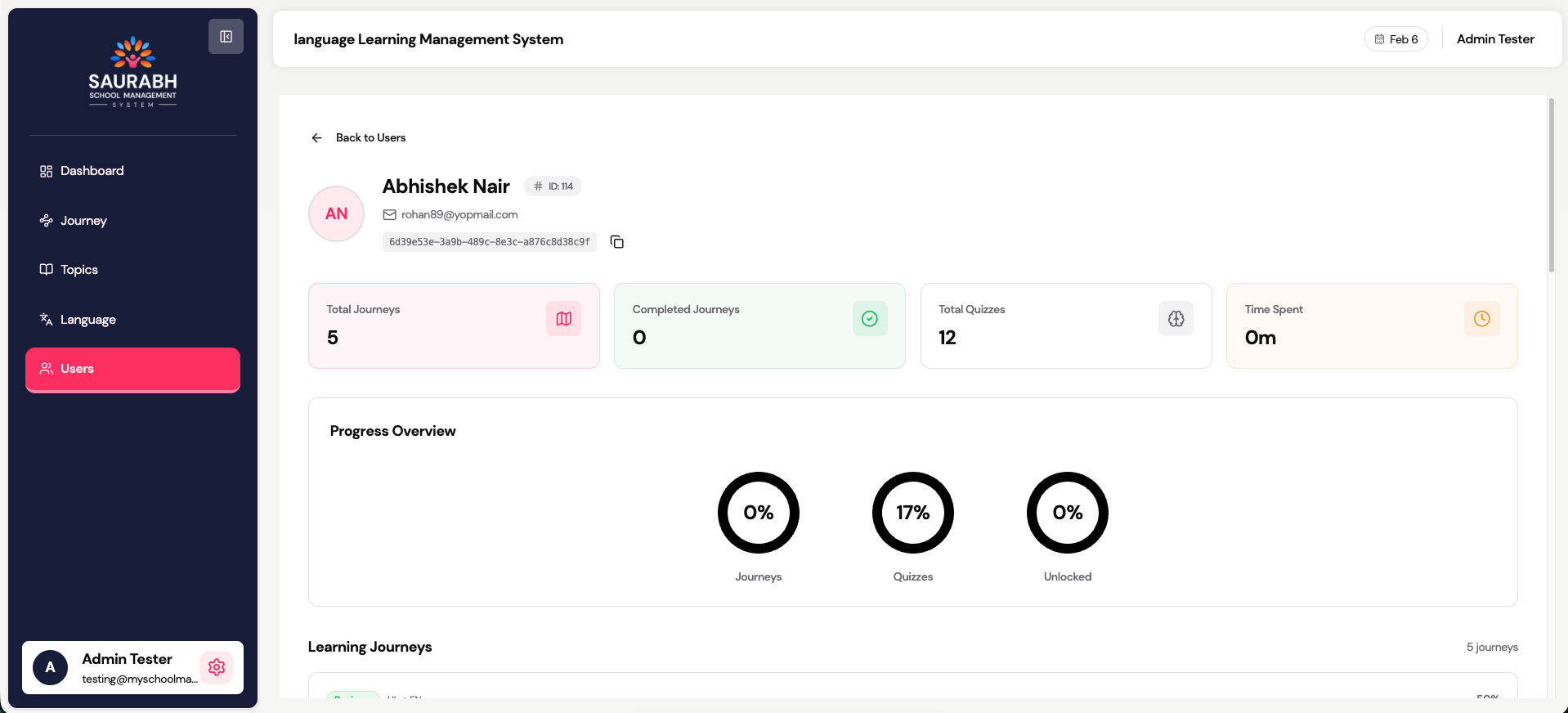 Each journey can be expanded to view modules and quiz attempts.