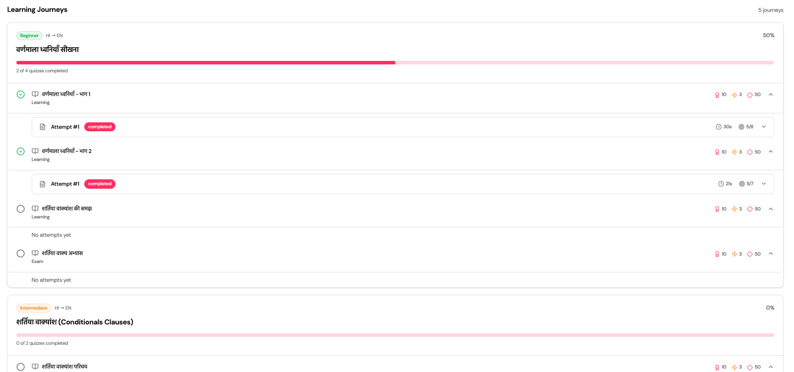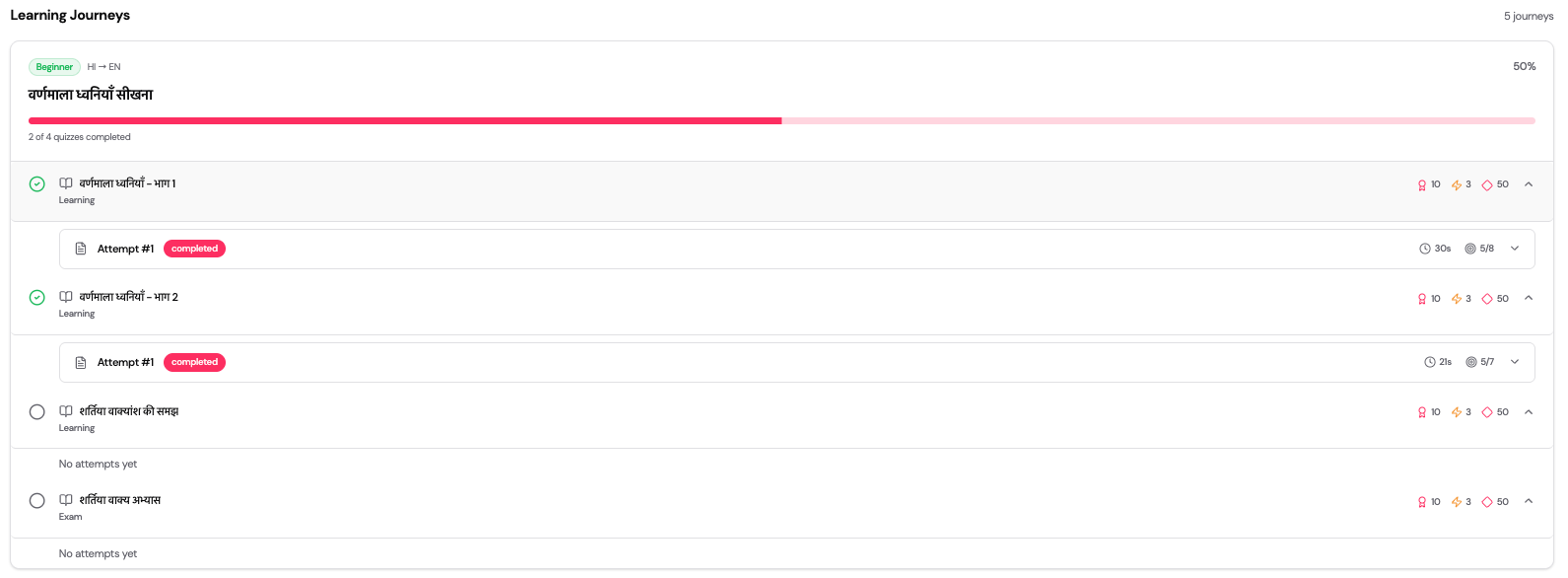 Shows all journeys assigned to the learner with progress details.
