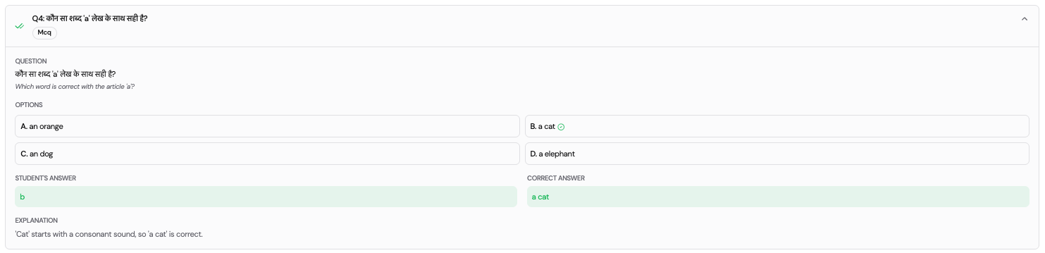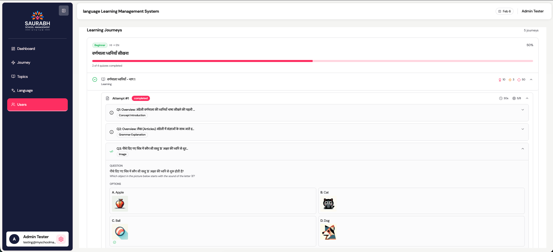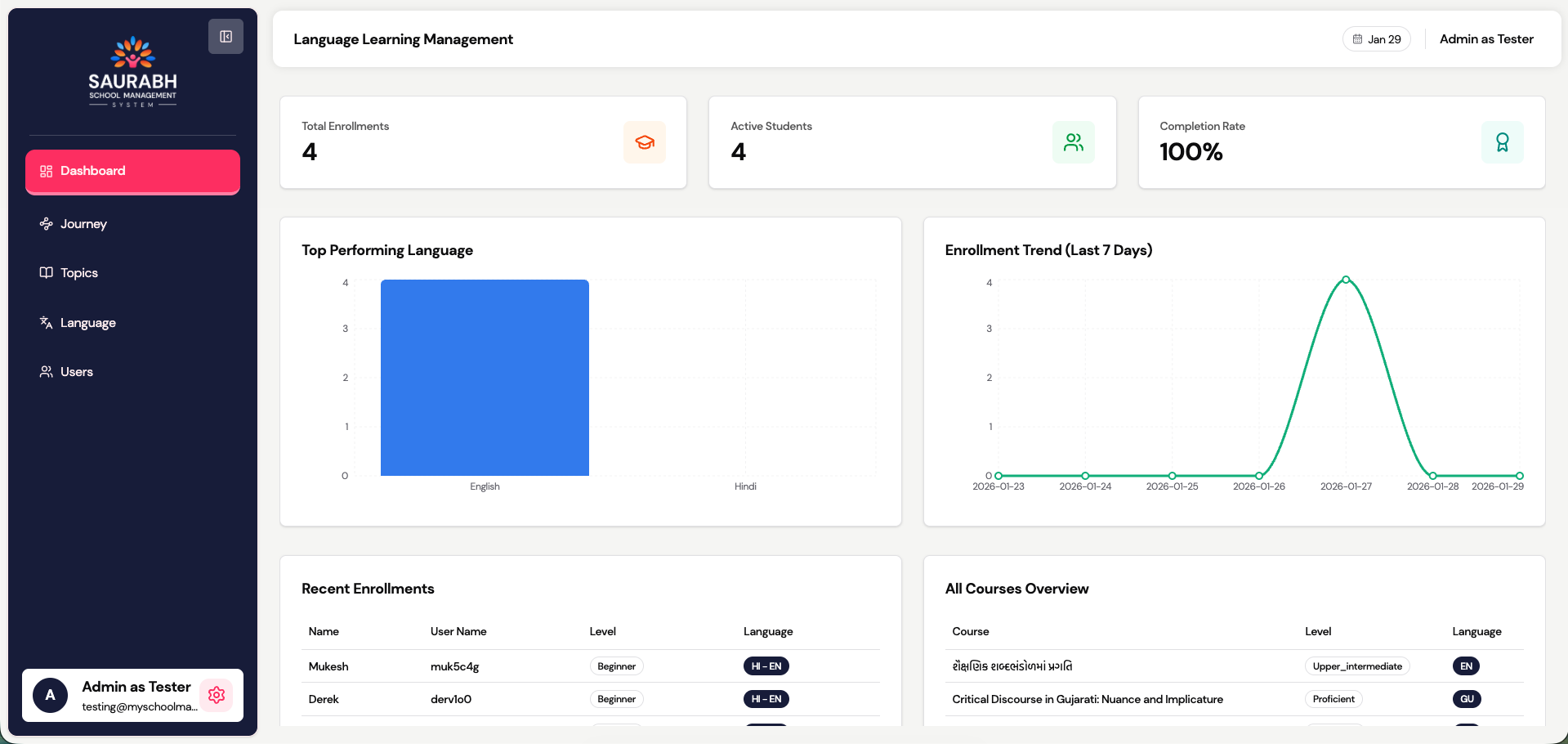 This module allows administrators to manage students, monitor learning activity, and analyze progress at a detailed level. It provides both high‑level insights and deep, question‑level visibility into each learner’s journey.