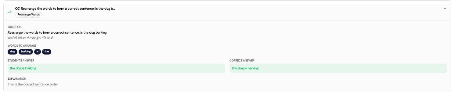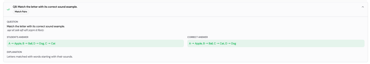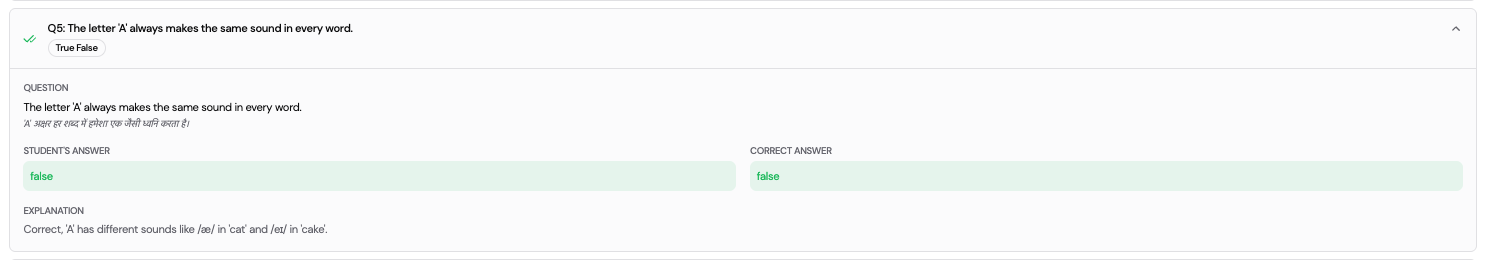 For each question, the following is displayed: