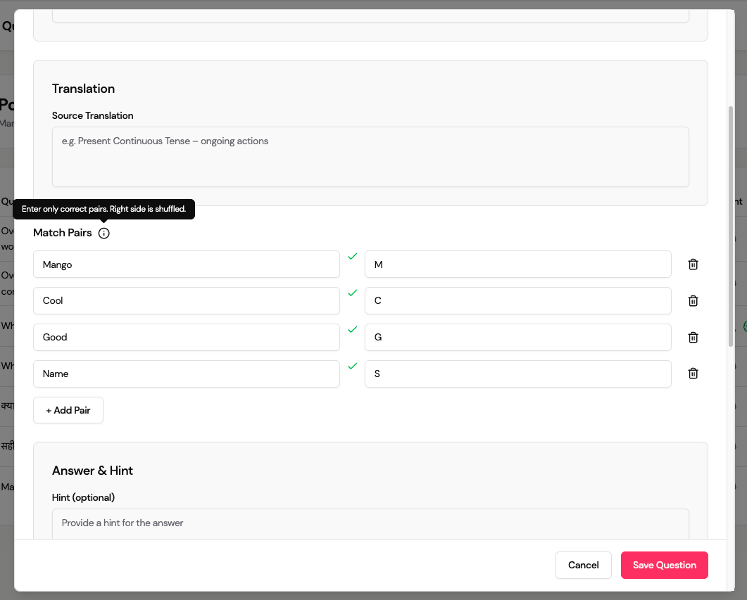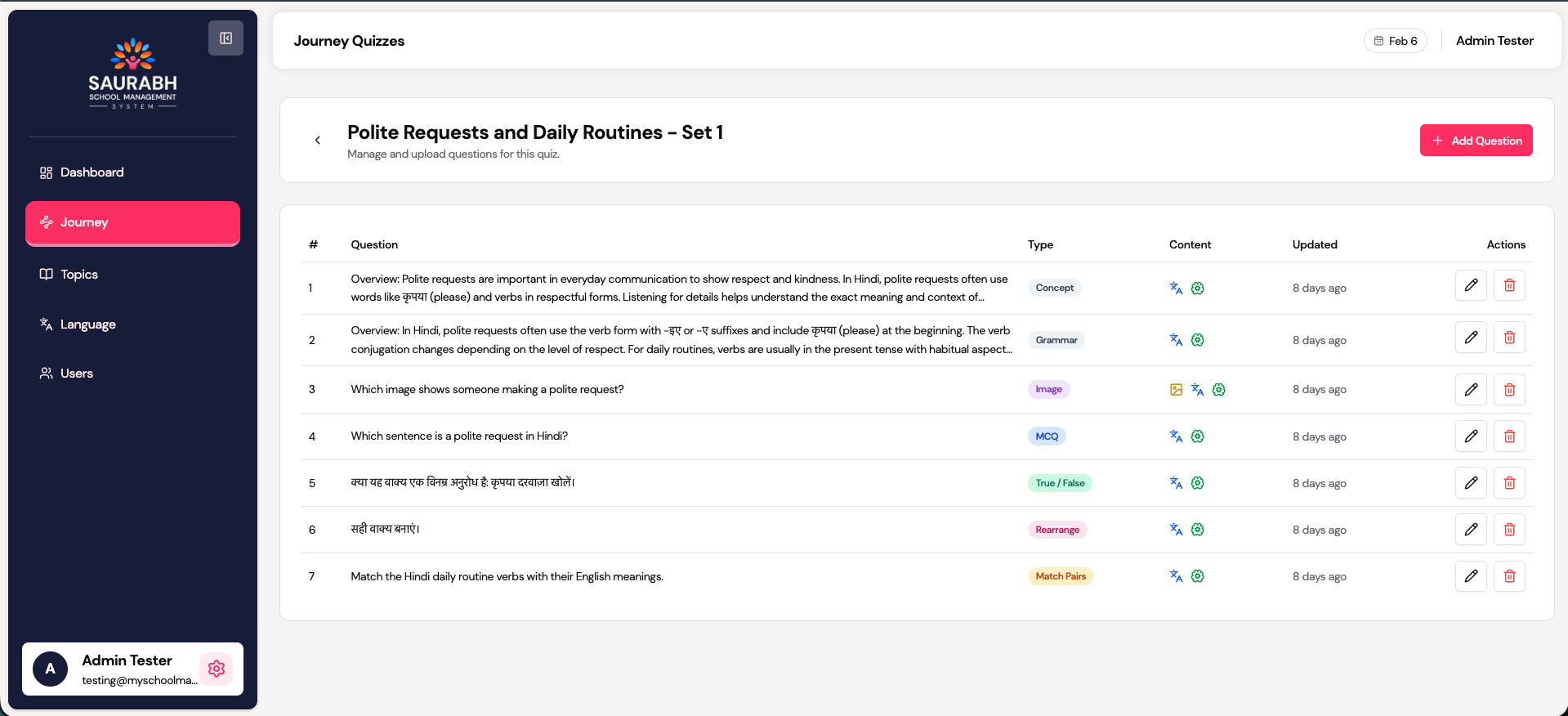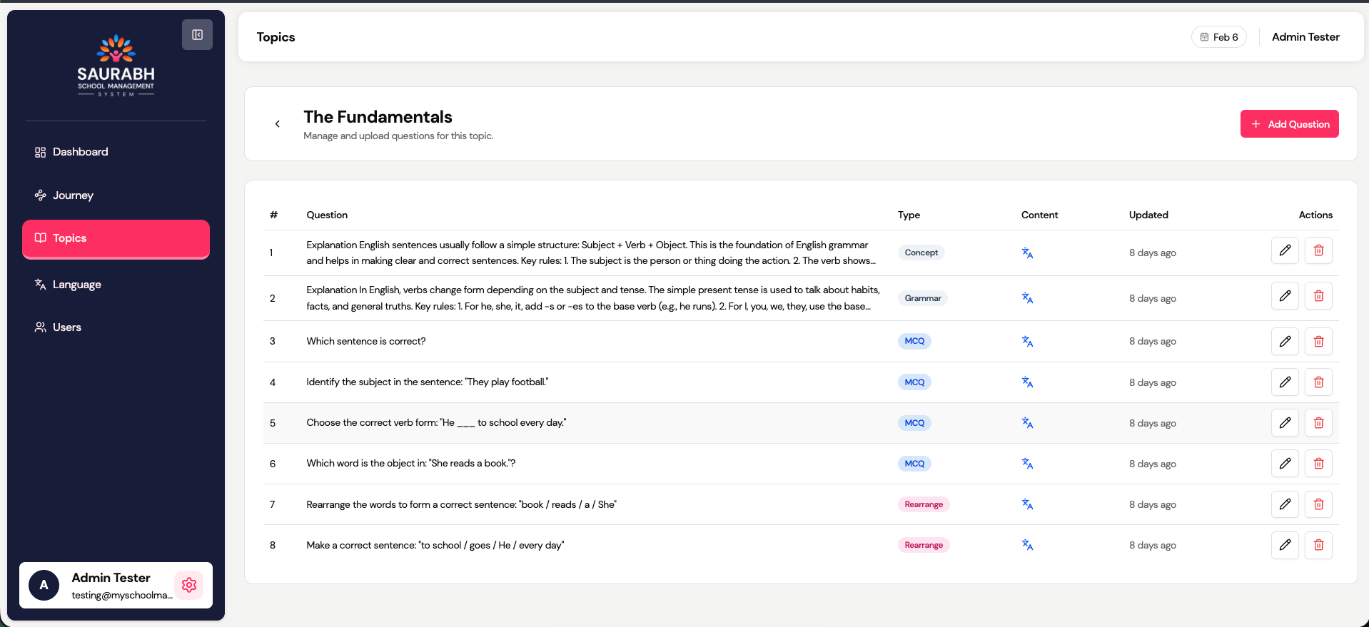 - View associated question, type, content info, and created/updated date