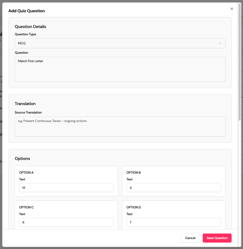- Question content (text/image/explanation)
