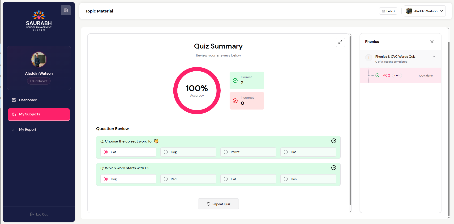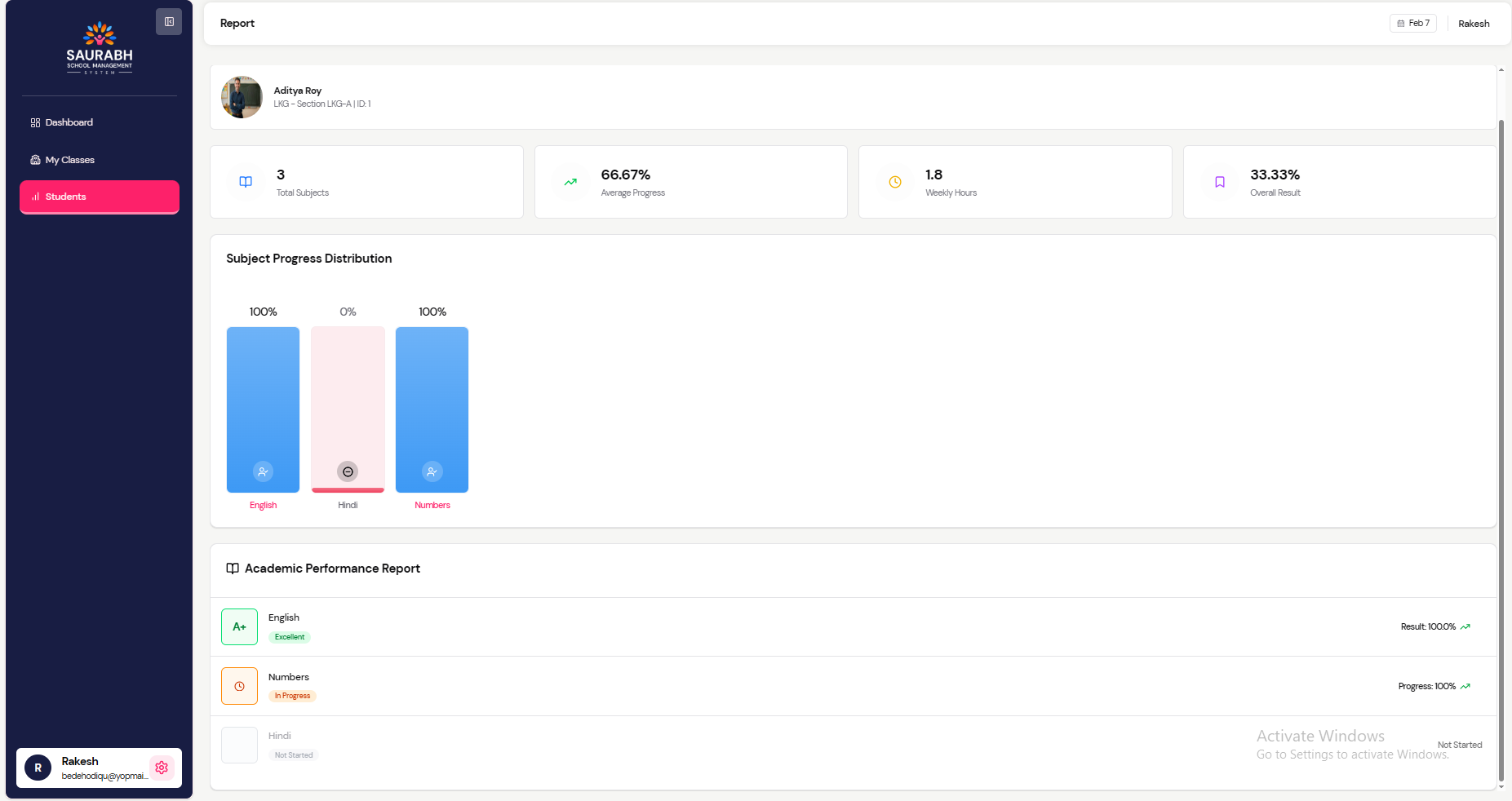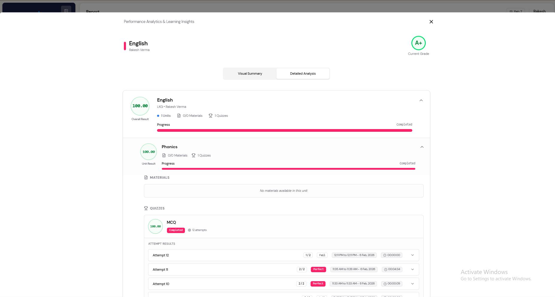 Admin and teachers can select a class and section to view the student list, manage LMS access (enable/disable) for each student, and access reports showing total subjects, average progress, weekly learning hours, and overall results for individual students and click on any subject to view both summary and detailed summaries, including number of attempts, correct answers, wrong answers, accuracy, and performance insights.