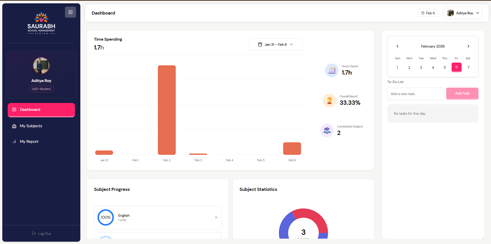 The Student Dashboard helps students track learning progress and manage daily study activities.