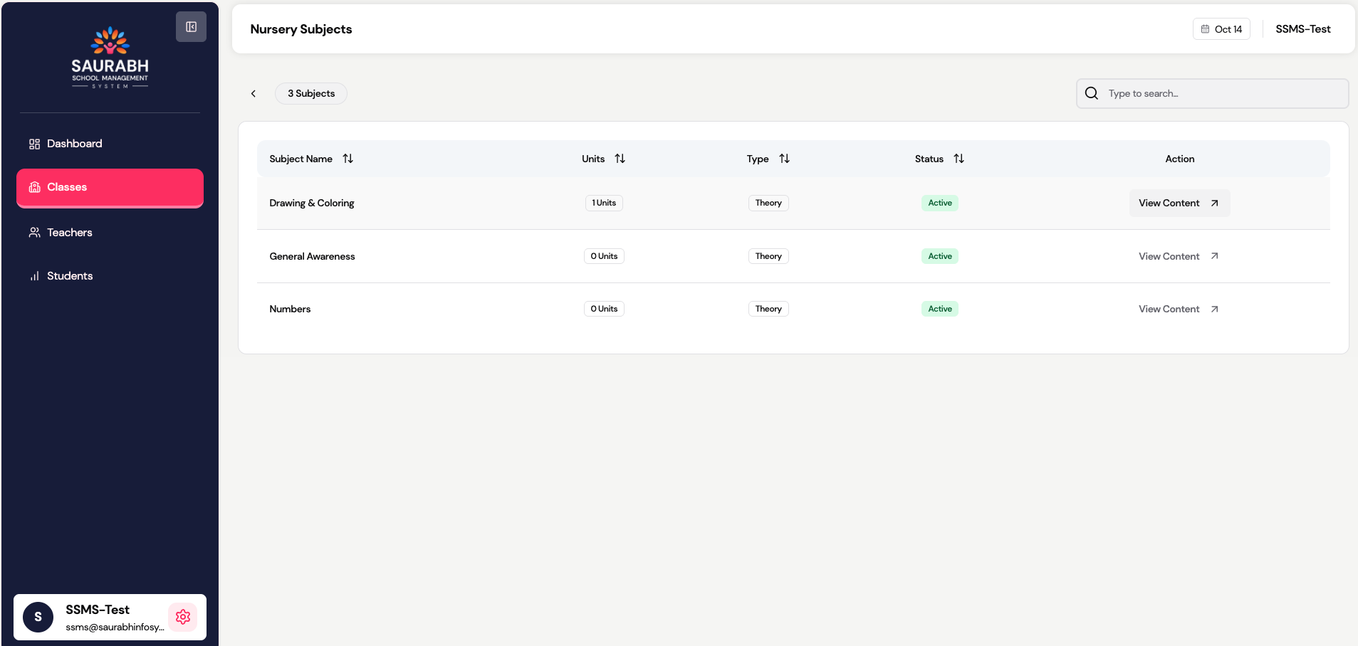 The LMS content creation follows a class-first navigation flow. Users must first select a class, then open a subject before creating or managing learning content.